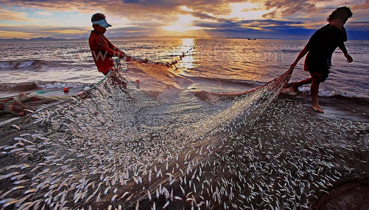 清晨拍摄海鱼港口和鱼类批发市场. 渔民将海鱼卸下船,修理渔网,晾晒渔网,为再次下海做准备.