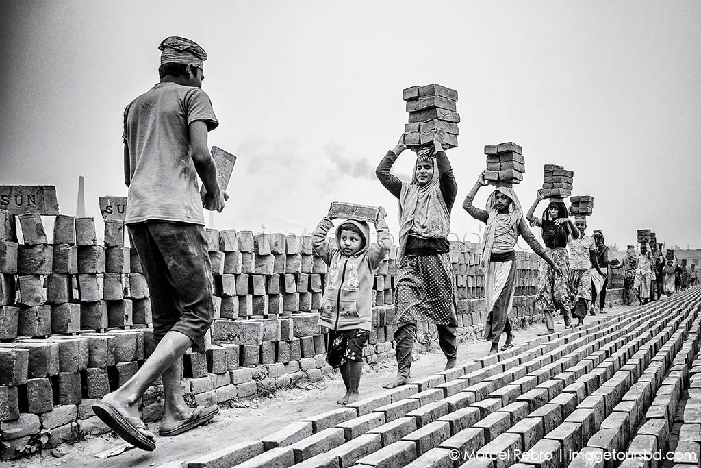 达卡市周围约300个砖厂,砖厂工人用传统工艺手工制砖. 有灰尘的红砖在头顶上搬运. 之后拍摄街道小贩和当地人文